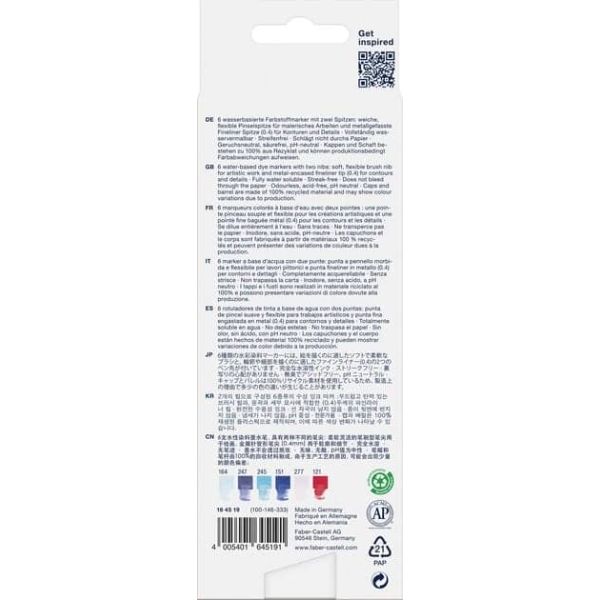 علامة صبغية ذات أساس مائي مع شريحتين رأس فرشاة ناعم ومرن للأعمال الفنية وطرف محدد مغلف بالمعدن لتحديد الخطوط والتفاصيل عرض الخط: طرف رفيع 0.6 مم قابل للذوبان في الماء بالكامل خالية من الخطوط لا ينزف من خلال الورق عديم الرائحة، خالي من الأحماض، درجة حموضة محايدة محفظة 6 الألوان: 121، 151، 164، 245، 247، 277 الأغطية والأسطوانة مصنوعة من مادة معاد تدويرها بنسبة 100% وقد تظهر اختلافات في اللون بسبب الإنتاج.