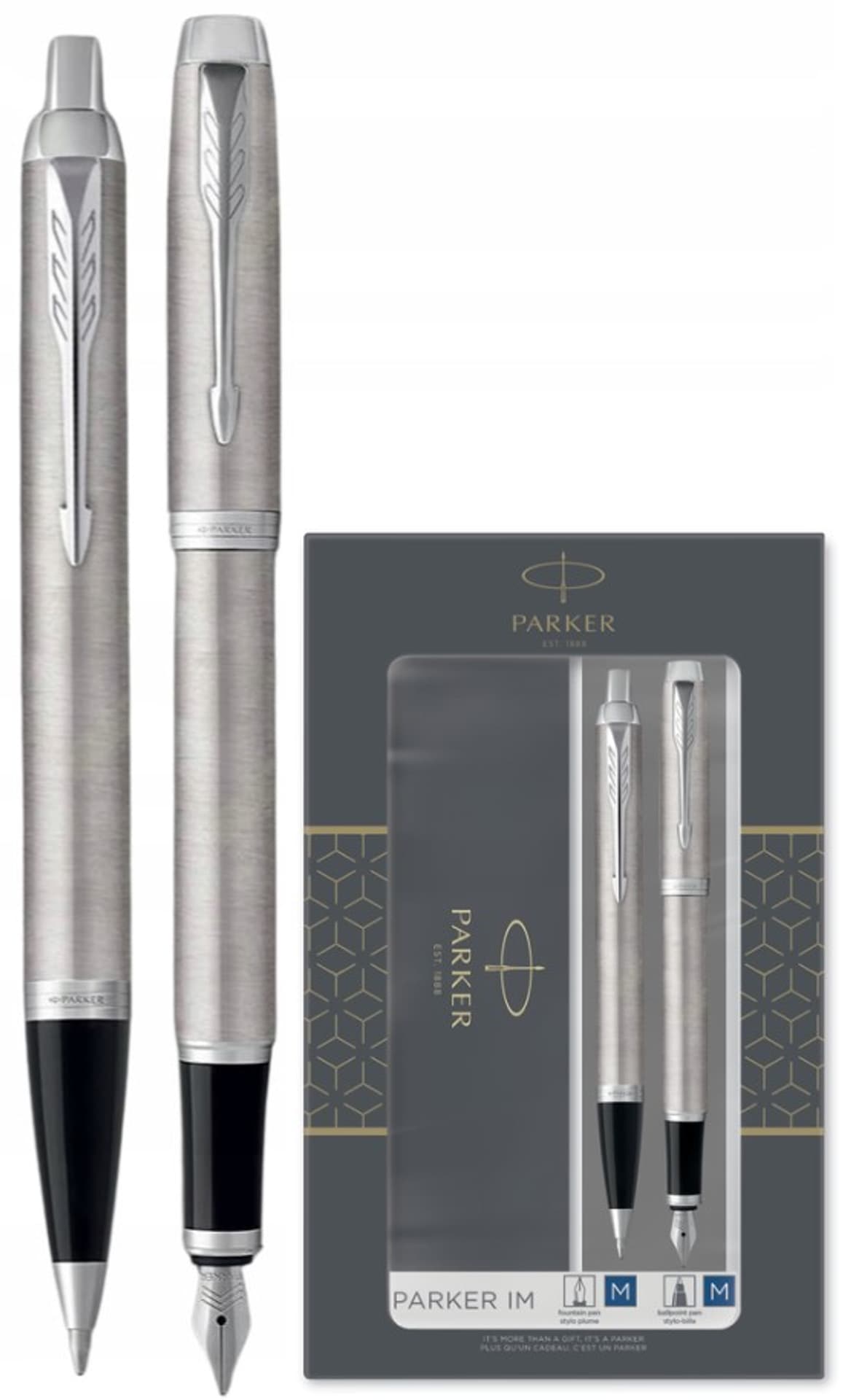 شكله الكلاسيكي ولونه الخالد يجعلان هذا الطراز رائجًا باستمرار. جميع محتوياته معبأة في علبة فاخرة، مما يعزز فخامة هذه المجموعة من الهدايا.سن قلم حبر سائل متين من الفولاذ المقاوم للصدأ يضمن الموثوقية ويعزز أسلوبك الخاص.صُمم قلم الحبر السائل باركر IM الأنيق والعملي خصيصًا للمحترفين الشباب، وهو مثالي لأي مكان عمل.يتميز قلم باركر IM بأنه موثوق وأنيق للغاية، وهو مصنوع من المعدن، مما يوفر تجربة كتابة فاخرة.مع أكثر من قرن من الخبرة والحرفية، يُبهر هذا القلم بتصميمه المميز، كما توفر مكوناته المعدنية المطلية بتقنية PVD مقاومة استثنائية للتآكل والتلف.يأتي قلم الحبر السائل العصري هذا معبأً بخراطيش كوينك أو حبر في زجاجة (بواسطة مكبس)، مما يوفر مستوى أعلى من الرقي في الكتابة. ومع عبوته الأنيقة، يُعد قلم باركر IM هدية لا تُنسى.مصنوع من الفولاذ المقاوم للصدأ المصقول اللامع بلمسات نهائية من الكروم، ويكمله مشبك باركر المميز على شكل سهم.يضمن رأس القلم المزود بنقرة وحبر QuinkFlow الموثوق كتابةً سلسة في أي وضع.مزيج من التصميم النحيف والعصري واللمسات النهائية الأنيقة والراقية وعالية الجودة.لمسات نهائية لامعة من الفولاذ الساتان والكروم، ومشبك باركر المميز على شكل سهم.لون حبر قلم الحبر: أزرق.يحتوي القلم والحبر على خرطوشة حبر جاهزة للاستخدام.