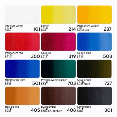 تتكون اللوحة من الألوان الأساسية التي يحتاجها الفنان للعمل بها. يتم الاحتفاظ باللمعان والكثافة وعمق اللون حتى بعد التجفيف. تتميز الدهانات بثباتيتها العالية وسهولة تطبيقها وخلطها. مناسبة لكل من الرسم التقليدي والتجارب الفنية. جودة فائقة الجودة. تعيين المحتويات 101 تيتانيوم أبيض | 214 ليمون | 237 أصفر دائم | 350 أحمر دائم | 319 كارمين | 508 كوبالت أزرق | 501 ضوء الترامارين | 703 فثالوسيانين أخضر | 727 زيتون اخضر | 405 سيينا الخام | 408 عدد محروق | 801 مصباح أسود |