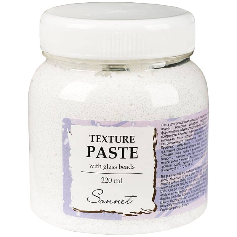 عجينة نسيجية مع حبيبات زجاجية تستخدم لتكوين نقش ثلاثي الأبعاد على أي سطح. ضعيه باستخدام فرشاة أو سكين لوح الألوان. بعد التجفيف، فإنه يشكل راحة دائمة ومقاومة للماء. يمكن طلاء السطح المجفف بالأكريليك والتمبرا والغواش والدهانات الزيتية. يمكن تخفيف المعجون بالماء. عندما يكون رطبًا، فإنه يمتزج جيدًا مع الدهانات. درجة حرارة النقل/التخزين: من +5 إلى +35 0 درجة مئوية.