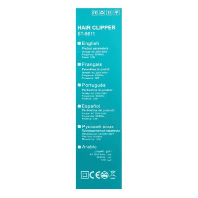 ماكينة حلاقة الشعرالجهد الكهربائي: ٢٢٠-٢٤٠ فولت تيار متردد، ٥٠/٦٠ هرتز القدرة الكهربائية: ١٢ واط محرك نحاسي: ٦٠٠٠ دورة في الدقيقة المادة: فولاذ مقاوم للصدأ + بلاستيك ABS سلك نحاسي ٢.٤ متر × ٢ × ٠.١٨ مم²