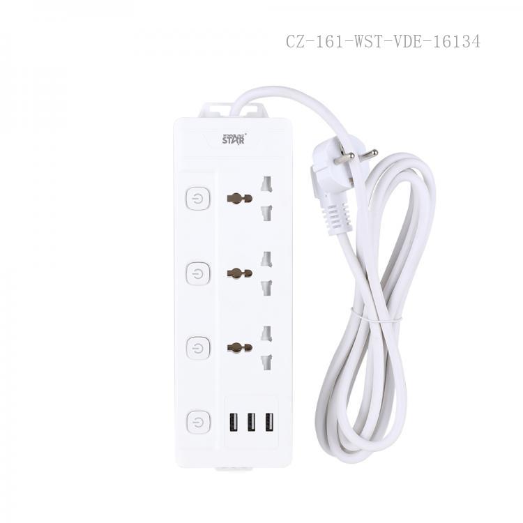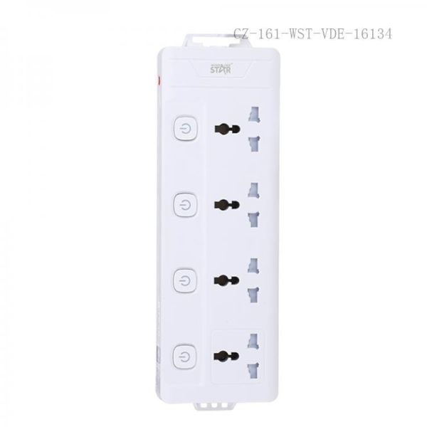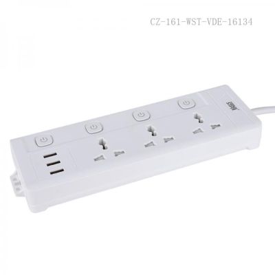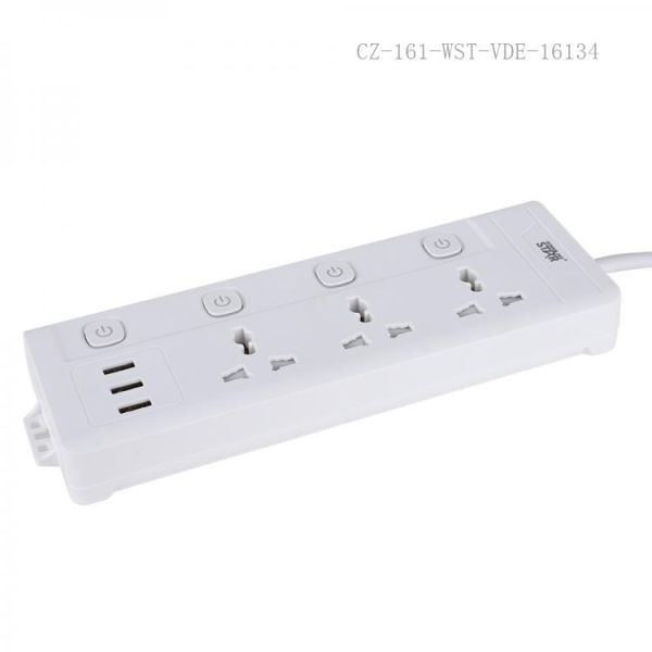 ثلاثة منافذ كهربائية و3 منافذ USB القدرة المقدرة: 10 أمبير، 2500 واط صمام مقاوم للحريق من مادة البولي بروبيلين (حتى 750 درجة مئوية) حماية من الحمل الزائد سلك نحاسي نقي نحاس متكامل مؤشر متعدد المفاتيح