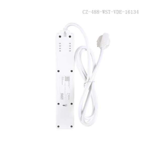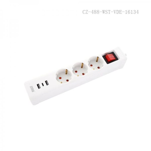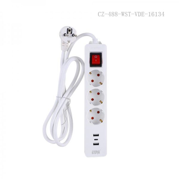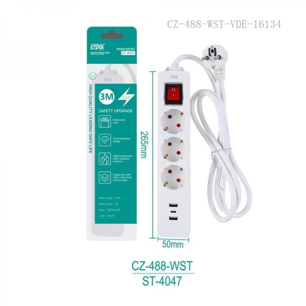 مقبس طاقة ST-4047، مصنوع من مادة البولي بروبيلين المقاومة للاشتعال، بجهد 220-250 فولت تيار متردد، 10 أمبير/2000 واط، مزود بثلاثة منافذ كهربائية معتمدة من VDE، ومنفذي USB ومنفذ Type-C، ومفتاح تشغيل/إيقاف، وقابس VDE