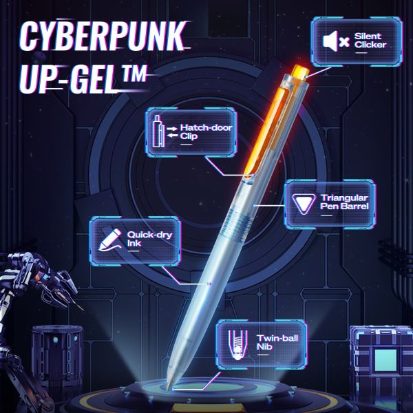 قلم Space Up Cyberpunk Gel Pen هو الخيار الأمثل لعشاق الأسلوب المستقبلي وراحة الكتابة. بفضل آلية النقر الصامتة، يتيح لك التركيز دون أي ضوضاء مزعجة. يرتفع وينخفض ​​مشبك "الباب" الفريد مع كل نقرة، مضيفًا لمسة عصرية وتقنية متطورة. يضمن تصميمه المريح راحة تامة حتى بعد ساعات من الكتابة. ينزلق رأس القلم المزدوج بتقنية الكرتين بسلاسة على الورق دون تسريب، بينما يمنع الحبر سريع الجفاف تلطيخ الورق.