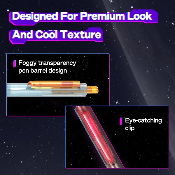 قلم Space Up Cyberpunk Gel Pen هو الخيار الأمثل لعشاق الأسلوب المستقبلي وراحة الكتابة. بفضل آلية النقر الصامتة، يتيح لك التركيز دون أي ضوضاء مزعجة. يرتفع وينخفض مشبك "الباب" الفريد مع كل نقرة، مضيفًا لمسة عصرية وتقنية متطورة. يضمن تصميمه المريح راحة تامة حتى بعد ساعات من الكتابة. ينزلق رأس القلم المزدوج بتقنية الكرتين بسلاسة على الورق دون تسريب، بينما يمنع الحبر سريع الجفاف تلطيخ الورق.