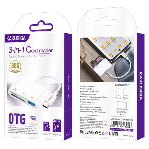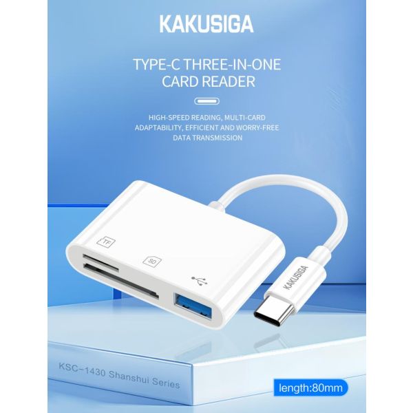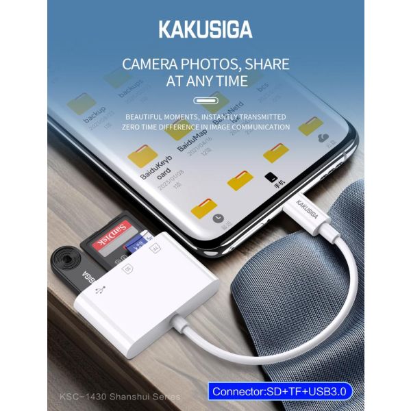 قارئ بطاقات KSC-1430 ثلاثي الوظائف 1. طول الكابل: 80 مم الموصلات: SD + TF + USB 3.0 2. أقصى سعة تخزين مدعومة لبطاقات SD/TF: 2 تيرابايت 3. سرعة نقل البيانات النظرية: 480 ميجابت في الثانية 4. سرعة نقل البيانات عبر منفذ USB 3.0: 5 جيجابت في الثانية 5. سهل الاستخدام، نقل سريع للصور، مشاركة الصور في أي وقت