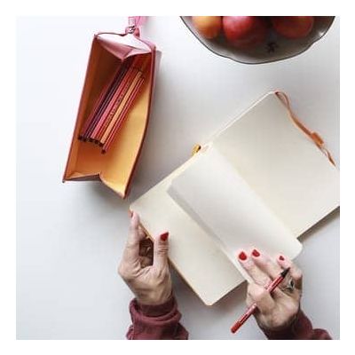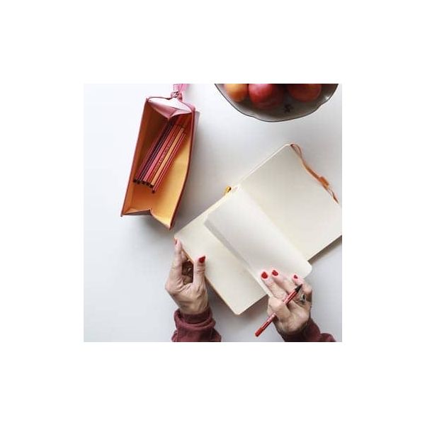 حافظة أقلام Rhodiarama من الجلد الصناعي الإيطالي مقاس 23x5x5 سم هي الإكسسوار الأساسي لتخزين الأقلام وأقلام التلوين وأقلام الرصاص، وهي أفضل أصدقاء الورق! الجزء الخارجي من الجلد الصناعي الإيطالي، الشعار منقوش، خياطة حقيقية، بطانة داخلية من البوبلين البرتقالي، سحاب طويل (يمكن استخدامه كمقبض عند ربطه بزر كبس)، فتحة مسطحة للاستخدام كحقيبة أقلام