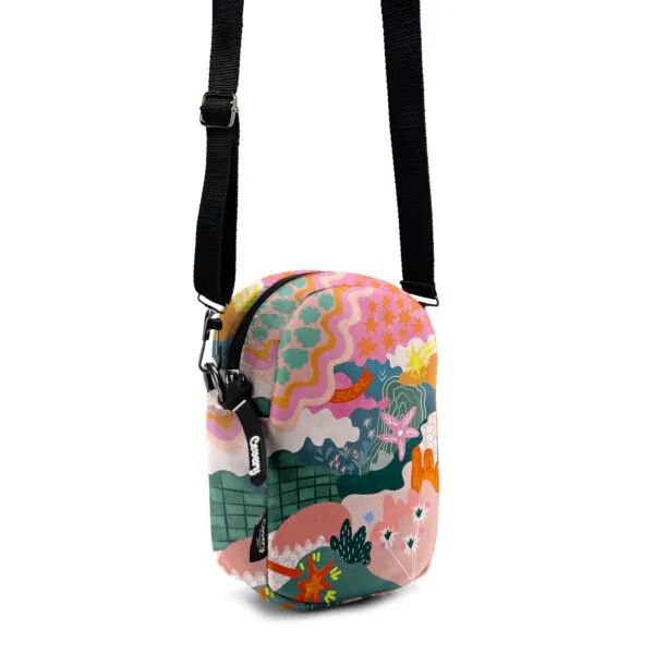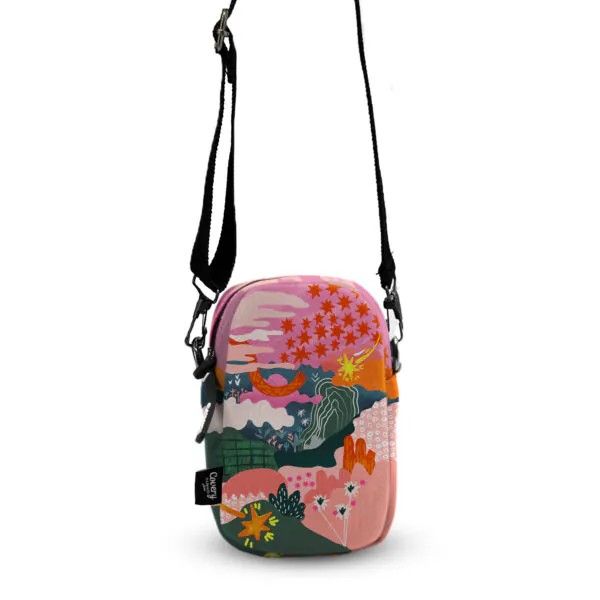 الخامة: قماش مطبوع عالي الجودة، بوليستر ممزوج بالقطن.الأبعاد: ١٩ × ١٤ × ٦ سم (قد يزيد أو ينقص بمقدار ٢-٣ سم حسب الخياطة). مزود بحزام قابل للتعديل. يحتوي على جيب خلفي خارجي. تعليمات العناية: تنظيف جاف.