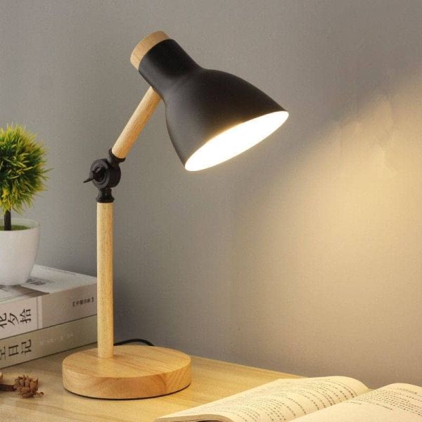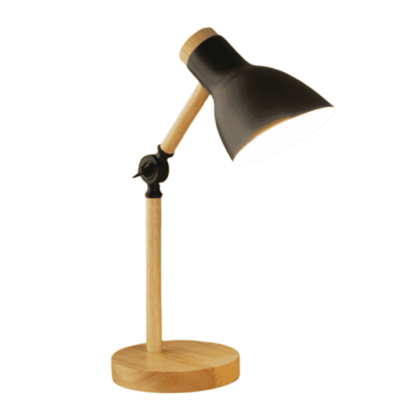 is a desk lamp featuring a wooden base, combining elegance and functionality.Material: High-quality metal lampshade with a wooden base for a sleek and modern look. Design: The combination of metal and wood offers a contemporary aesthetic suitable for various interior styles. Color: Black finish adds a touch of sophistication to your workspace. Usage: Ideal for reading, studying, or adding ambient lighting to your desk or bedside table.
