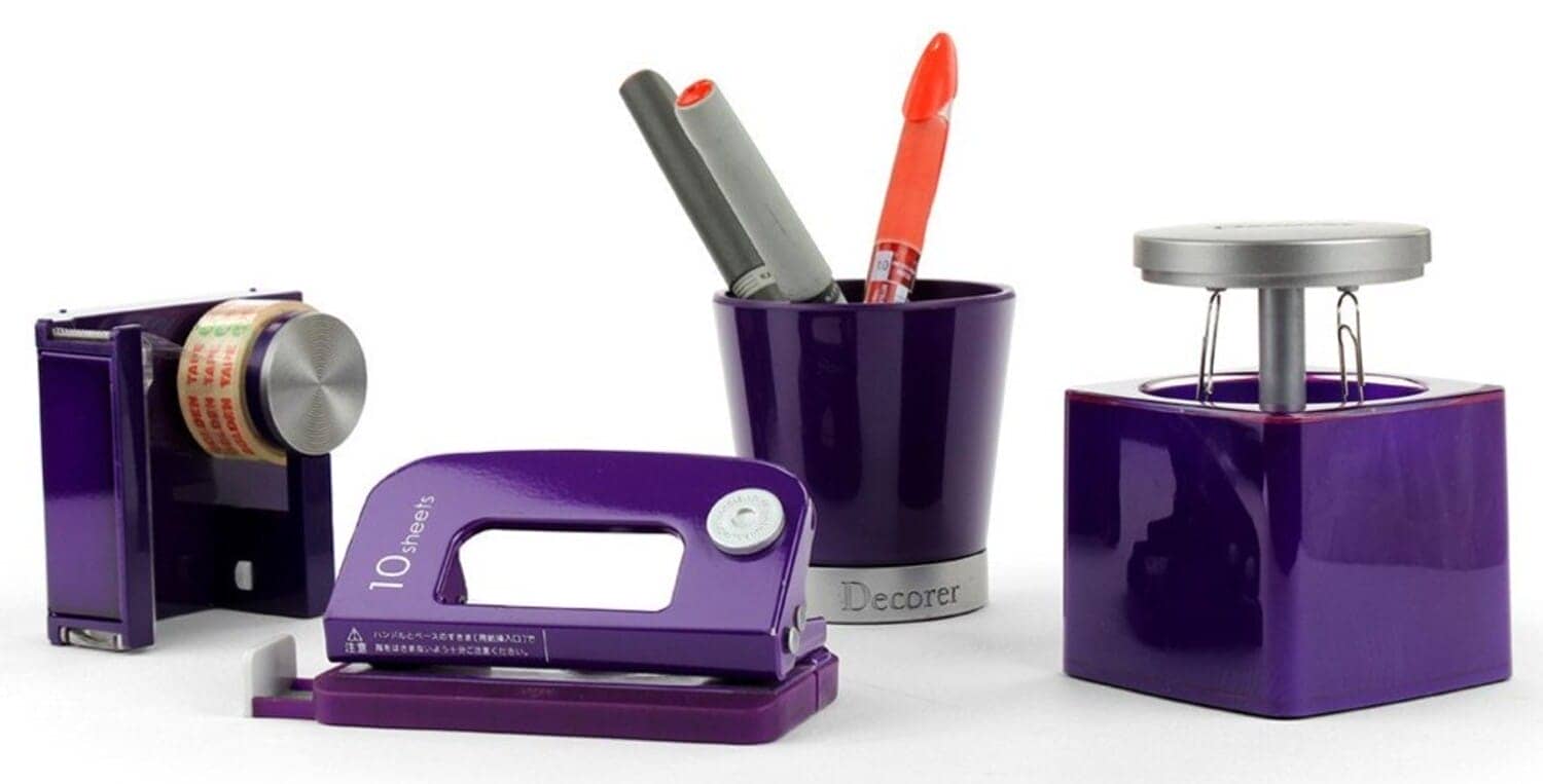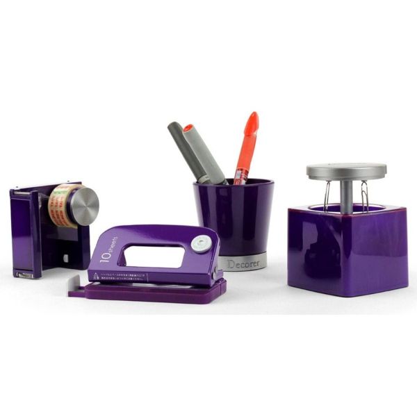 1" core tape dispenser. 10 Sheet capacity punch. Desk pencil holder. Paper clip cube with magnet top. Available in purple