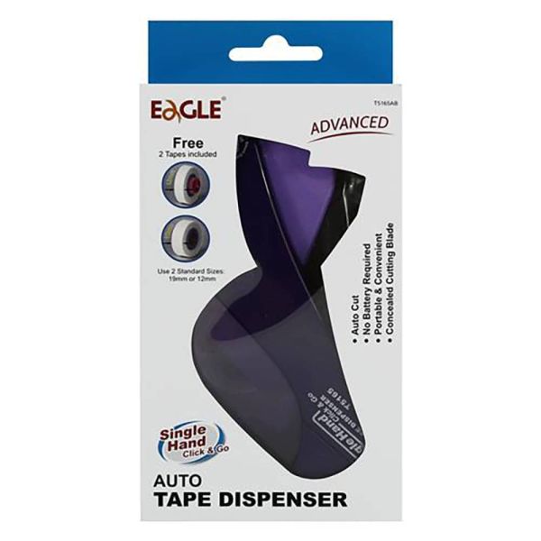 يعمل موزع الشريط Eagle بدون استخدام البطارية. صديقة للبيئة بنسبة 100%. أشرطة بحجم 19x33 ملم أو 12x33 ملم. قرص قطع مخفي قوي جدًا. شريطين لاصقين في العبوة.