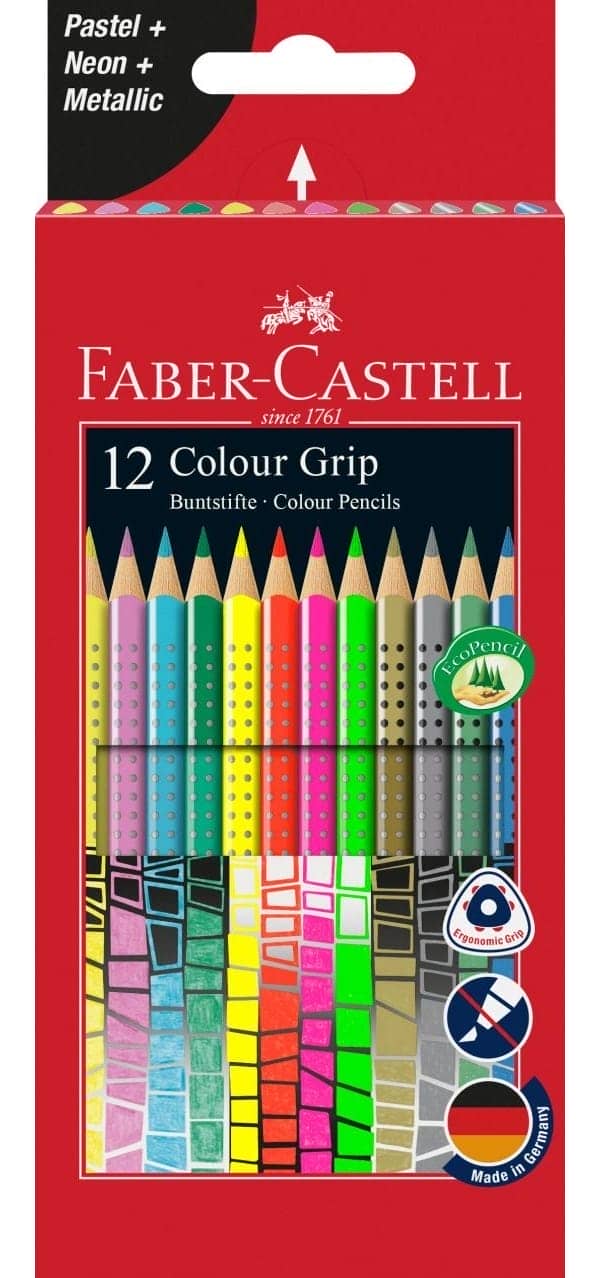 أبرز الألوان لأقلام الرصاص الملونة Grip في مجموعة واحدة المحتوى: 4 أقلام تلوين من الباستيل و4 أقلام تلوين من النيون والمعدن قلم تلوين مع منطقة قبضة حاصلة على براءة اختراع لقبضة آمنة وغير قابلة للانزلاق شكل مثلث مريح ألوان رائعة وضع اللون الناعم أعلى مقاومة للكسر بسبب عملية الربط الآمن (SV) يُغسل من معظم الأقمشة الخشب من الغابات المستدامة ورنيش مائي صديق للبيئة مناسبة لمستخدمي اليد اليمنى واليسرى مع لوحة الاسم