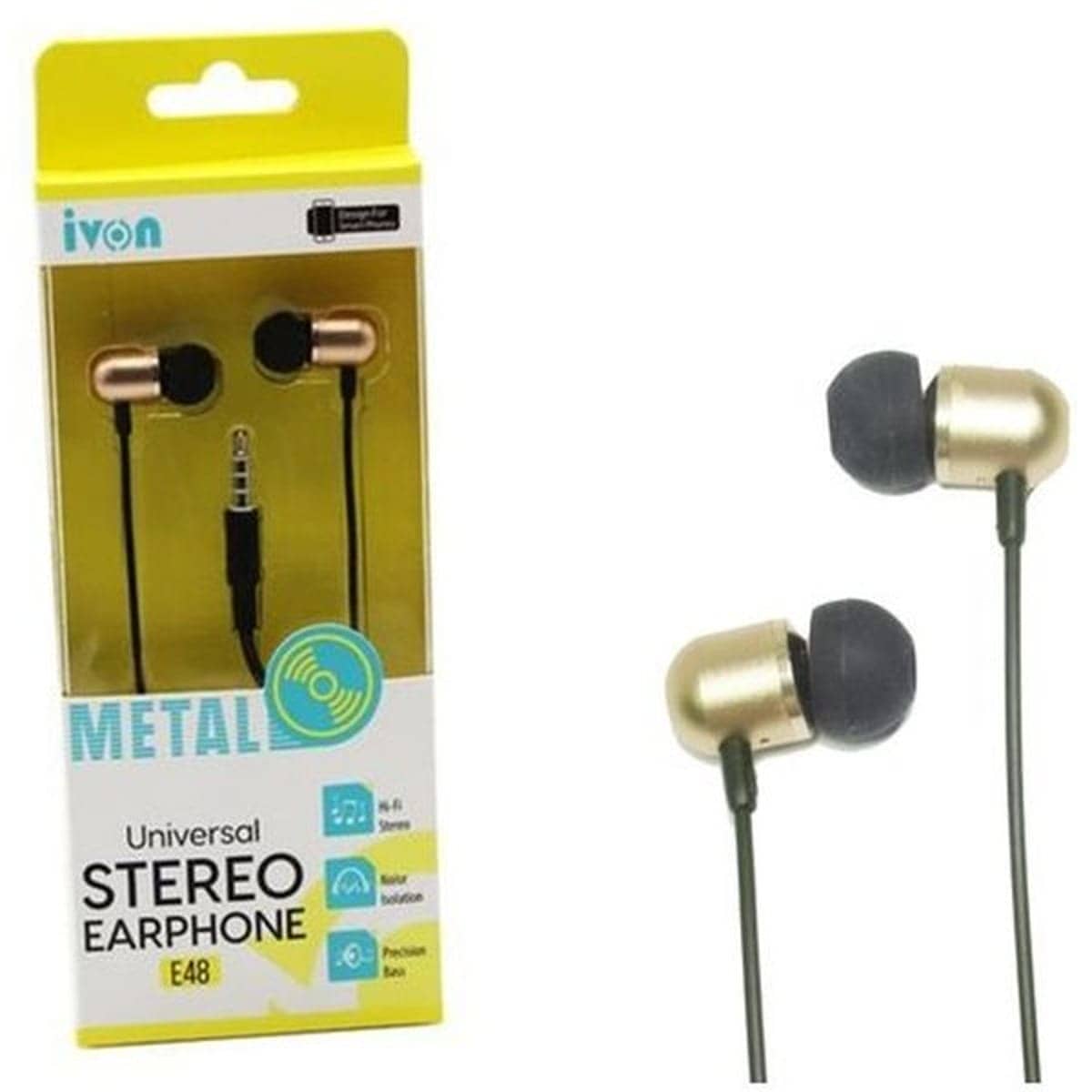 ivon stereo earphone 130cm jack 3.5mm black e48 high quality applicable to the 3.5 foot interface the stereo output dynamic combination Ideal for private hands-free operation. The one-touch button answers and ends calls Noise-Isolating Soft Ear-Gels. Call Answer/End Button Comfortable soft ear gels help isolate your ears and block out external noise while listening to music. Universally compatible for use with cell phones and other mp3 player devices that support phone calling and equipped with a standard 3.5mm jack (remote control may not work on other devices). A light weight Dual Bud Stereo Headset that sits neatly on your ears. Provides convenient hands free functionality, enabling you to listen to your phone's MP3 music. This 3.5mm Hands-free Stereo Headset is for you to use to carry hands-free calls via your cell phone or just enjoy listening to music on your phone. It is suitable for most cell phones, PDAs, portable games and music players with any standard 3.5 mm hands-free headset