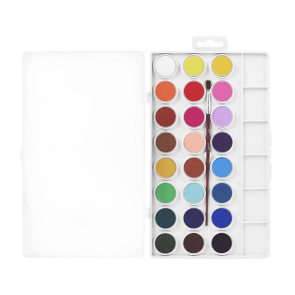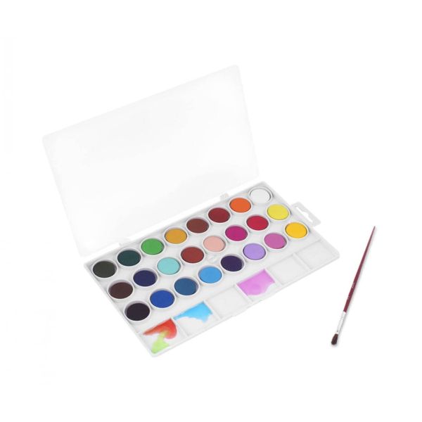 أقراص 22 ملم بألوان زاهية وحيوية مزود بأكواب لسهولة الخلط مع الماء تشطيب تغطية ممتاز من السهل تخفيفه بالماء تتضمن فرشاة