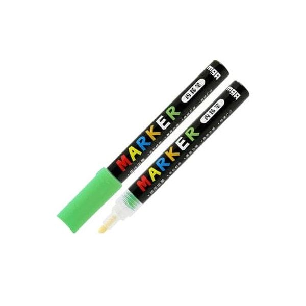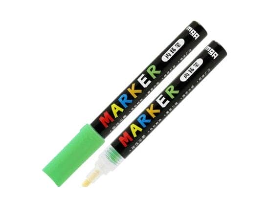 قلم أكريليك للتزيين والرسم على معظم الأسطح مثل: الخشب، الورق المقوى، الورق، القماش، الزجاج، المطاط، البلاستيك، الفولاذ، الحجر، القماش، البوليسترين مقاوم للماء وسريع الجفاف مقاوم جدًا لأشعة الشمس، ويتميز بالالتصاق العالي بالركيزة سمك الخط 2 مم