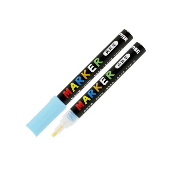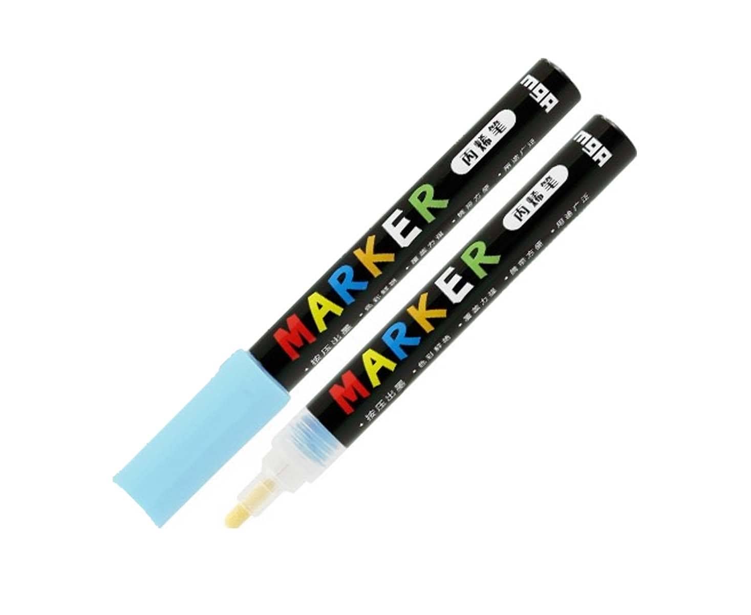 قلم أكريليك للتزيين والرسم على معظم الأسطح مثل: الخشب، الورق المقوى، الورق، القماش، الزجاج، المطاط، البلاستيك، الفولاذ، الحجر، القماش، البوليسترين مقاوم للماء وسريع الجفاف مقاوم جدًا لأشعة الشمس، ويتميز بالالتصاق العالي بالركيزة سمك الخط 2 مم