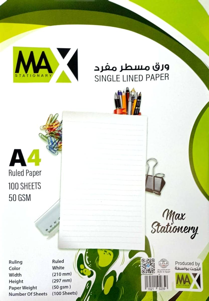 رزمة ورق مسطر مفرد Max ابيض50جرام 100ورقة مقاس21*29.7سم