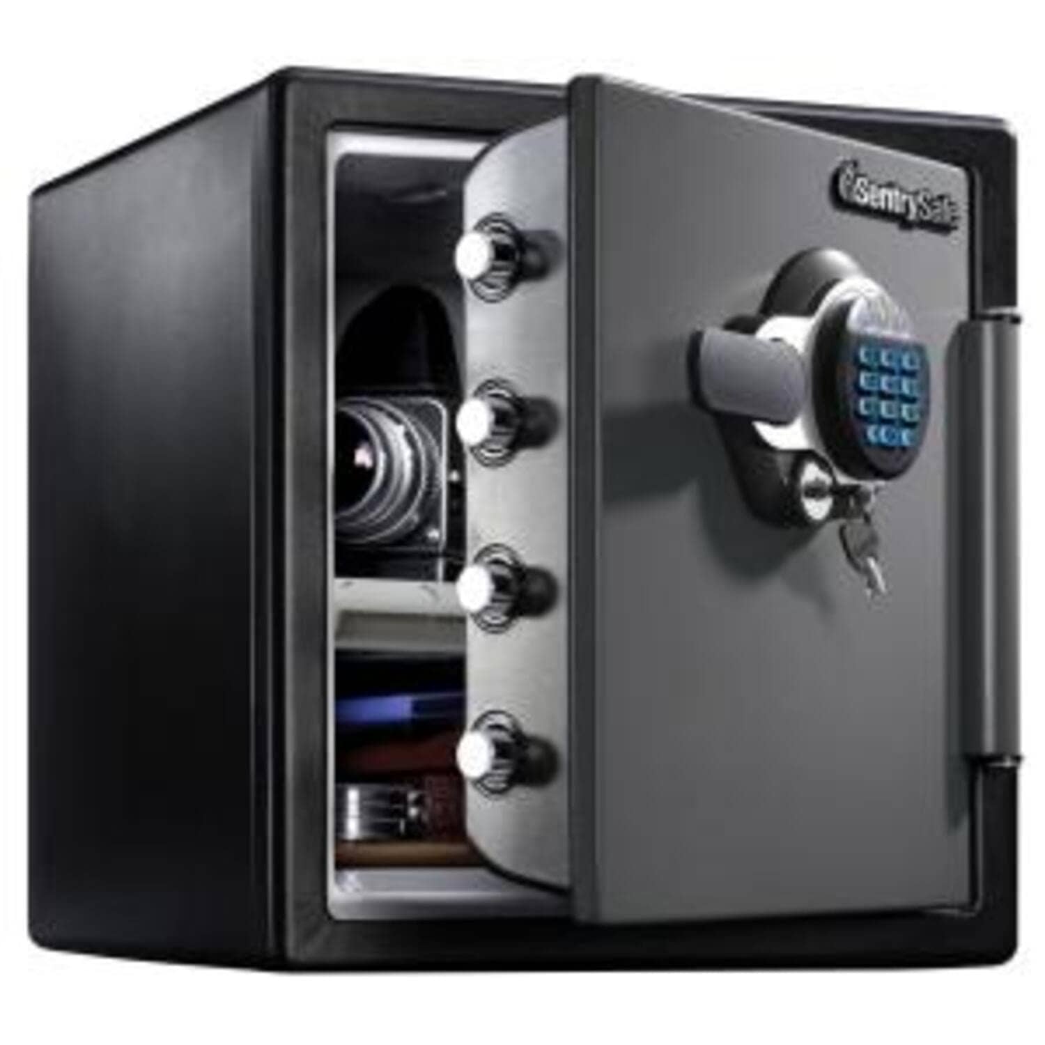 القفل الرقمي يستخدم نظام القفل الرقمي الذي يعمل بالبطارية رمزًا قابلاً للبرمجة مكون من 1 إلى 8 أرقام. تختلف خيارات المستخدم المتعددة حسب الطراز. 4 براغي كبيرة مقاس 1 بوصة أكبر بنسبة 60% من الخزائن التقليدية حماية الوسائط الرقمية قم بحماية الأجهزة اللوحية والهواتف والأقراص الصلبة الخارجية وبطاقات الذاكرة ومحركات أقراص USB والأقراص المضغوطة وأقراص DVD وأجهزة التخزين الإلكترونية الأخرى. شريط مفصلي مقاوم للتطفل يعزز شريط المفصلات المقاوم للنزع باب الخزنة لمزيد من الحماية ضد السرقة. البناء الصلب هيكل فولاذي متين لحماية دائمة وموثوقة. التنظيم الداخلي رف المفاتيح، وصينية الباب، وجيب الباب العميق، وصينية قابلة للتعديل الإضاءة الداخلية توفر الإضاءة الداخلية رؤية أفضل في الأماكن ذات الإضاءة الخافتة، بحيث يمكنك الوصول بسهولة إلى العناصر الخاصة بك دون إضاءة إضافية. برنامج استبدال ما بعد الحريق إذا تعرضت خزنتك للحريق، فسوف ترسل SentrySafe خزنة بديلة مجانًا، وبالتالي فإن الأشياء الأكثر أهمية محمية للأجيال القادمة. مفتاح مزدوج يمنح مالكي الخزنة القدرة على تعطيل القفل الأساسي، حتى إذا كان الأشخاص الآخرون يعرفون المجموعة أو رمز الوصول