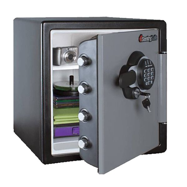 تم تصميم SentrySafe SFW123GSC لحماية المستندات والوسائط الرقمية والأشياء الثمينة الأخرى من الحريق والماء والسرقة. توفر الأجهزة المثبتة بمسامير وشريط المفصلات المقاوم للنزع أمانًا إضافيًا ضد الوصول غير المصرح به. سمات القفل الرقمي يستخدم نظام القفل الرقمي الذي يعمل بالبطارية رمزًا قابلاً للبرمجة مكون من 1 إلى 8 أرقام. تختلف خيارات المستخدم المتعددة حسب الطراز. 4 براغي كبيرة مقاس 1 بوصة أكبر بنسبة 60% من الخزائن التقليدية حماية الوسائط الرقمية قم بحماية الأجهزة اللوحية والهواتف والأقراص الصلبة الخارجية وبطاقات الذاكرة ومحركات أقراص USB والأقراص المضغوطة وأقراص DVD وأجهزة التخزين الإلكترونية الأخرى. يعزز شريط المفصلات المقاوم للنزع باب الخزنة لمزيد من الحماية ضد السرقة. البناء الصلب هيكل فولاذي متين لحماية دائمة وموثوقة. التنظيم الداخلي رف للمفاتيح، وصينية باب، وجيب باب عميق، ورف قابل للتعديل الإضاءة الداخلية توفر الإضاءة الداخلية رؤية أفضل في الأماكن ذات الإضاءة الخافتة، بحيث يمكنك الوصول بسهولة إلى العناصر الخاصة بك دون إضاءة إضافية. بولت داون هاردوير يضمن عدم قدرة اللصوص على إزالة الخزنة بسهولة من منزلك أو مكتبك. مفتاح مزدوج يمنح مالكي الخزنة القدرة على تعطيل القفل الأساسي، حتى إذا كان الأشخاص الآخرون يعرفون المجموعة أو رمز الوصول
