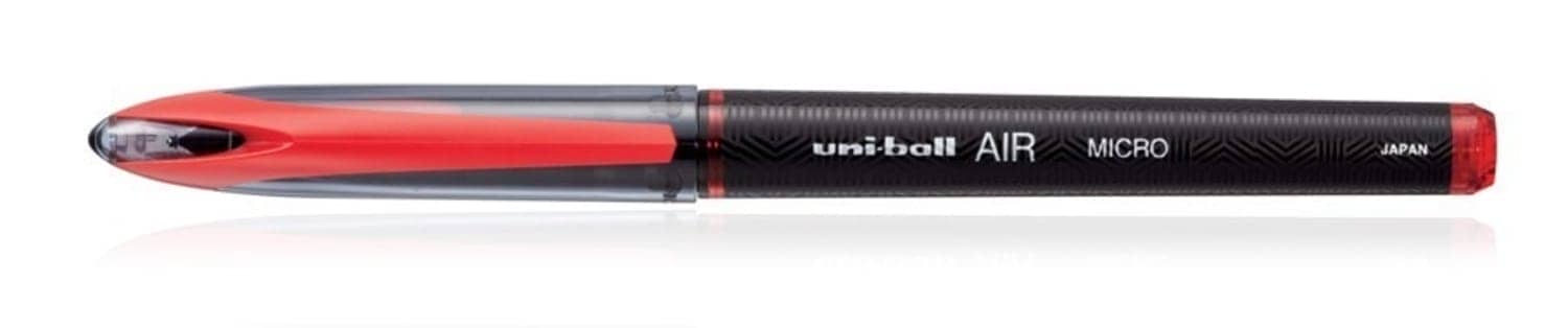The uni-ball Air Micro rollerball pen writes with the look of a fountain pen but without the leaks. It uses uni-ball famous fade-proof, water resistant and tamper proof Super Ink. Available in black, blue and red.Rollerball Micro Free moving pen tip Less friction when held at an angle. Contains fade-Free water resistant Super Ink