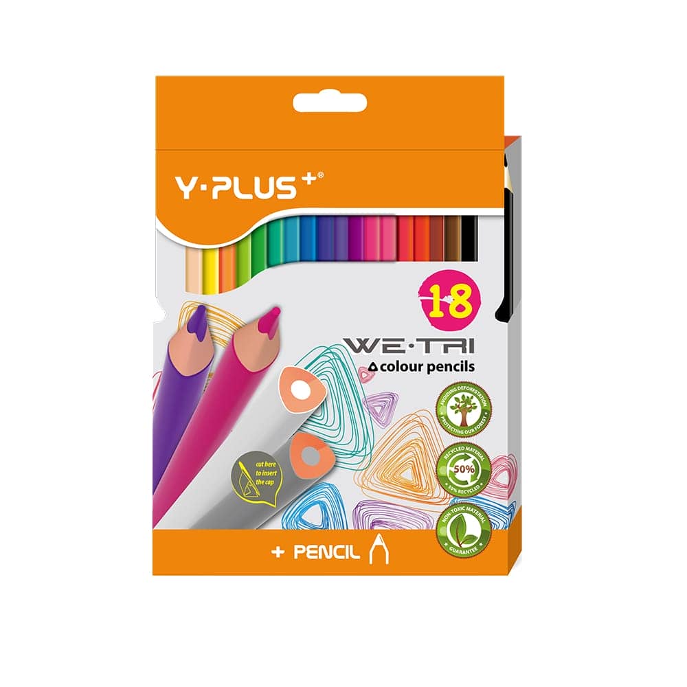 Y-Plus WE TRI Color Pencils 18 Assorted Colors Brand : Y-PLUS Coloured pencils 18 colors WE-TRI. Pencils comfortable for drawing, easily sharpened, and the hard pencil lead is made of high quality natural material. Bright colours, soft uniform lines. Case colour matches the colour of pencil lead.