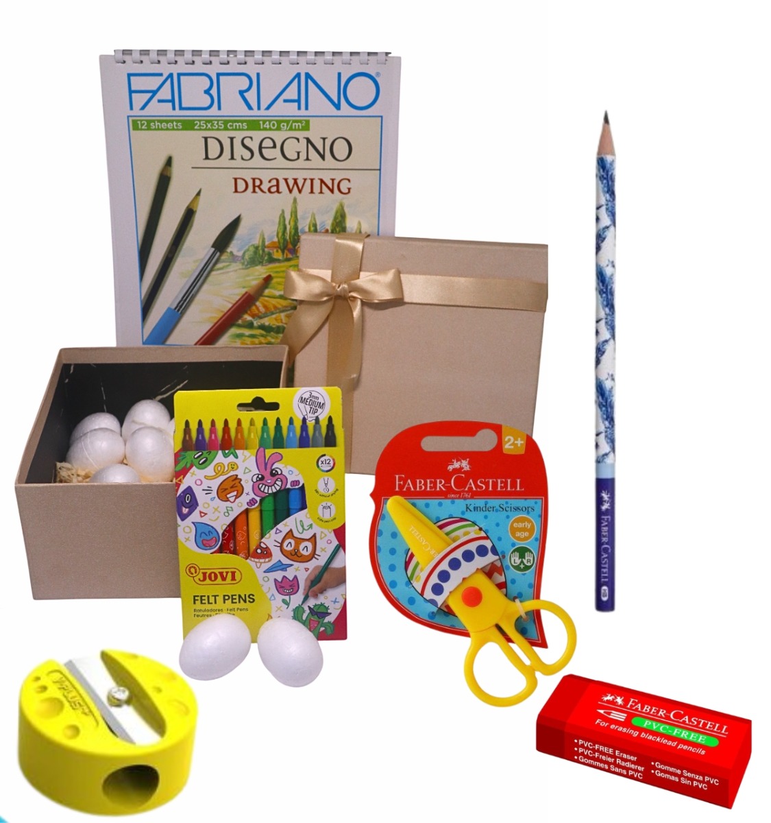 | Enjoy the joyful vibes of Sham El-Nessim with our special craft box Box Contents: 2 Pack White foam bag for crafts, egg shape, 5 pieces Fabriano sketchbook, 140g, white, printed cover, 1/8 sheet/12 Jovi /Marker Pens12 Assorted Colors Wooden pencil without eraser, HB (PEACOCK) Children's scissors Y-Plus plastic pencil sharpener, 1 eye, Bubble Faber-Castell PVC-FREE eraser, red Craft paper bag, colors Plain colored cardboard gift box with satin ribbon, square shape, size 11.5*20.5*20.5cm |